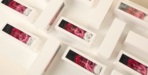 Quatre Strings Blossom, façonnés en fleurs et placés dans une boîte blanche avec logo, constituent le cadeau parfait pour célébrer l’amour.